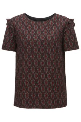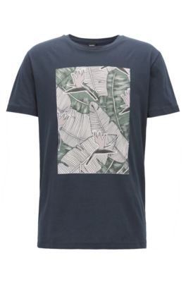Männliches Model in schwarzem T-Shirt mit Print von HUGO Männliches Model in schwarzem T-Shirt mit Print von HUGO