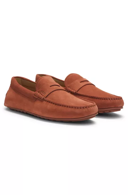 In Portugal gefertigte BOSS Loafer aus supersoftem Veloursleder mit flexibler Sohle. Zeitloser Penny-Riemen mit dezentem Logo-Detail. Dieses Produkt enthält mindestens 80 % bessere Rohstoffe. Das Leder in diesem Produkt stammt aus zertifizierten Gerbereien.