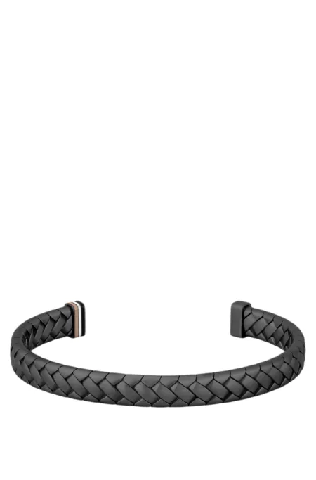 Schwarzes Armband aus geflochtenem Leder mit Fischgrätmuster auf dem Metall-Detail