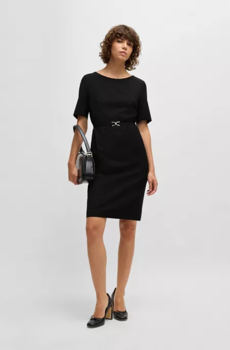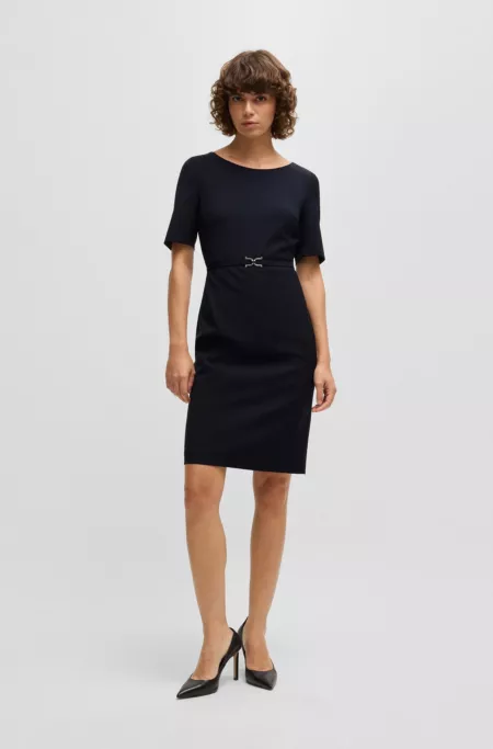 Das BOSS Kleid aus natürlich elastischer Schurwolle verspricht ganzjährig hohen Tragekomfort und ist ein zeitloser Klassiker. Gürtel mit charakteristischem Metall-Detail an der Taille.