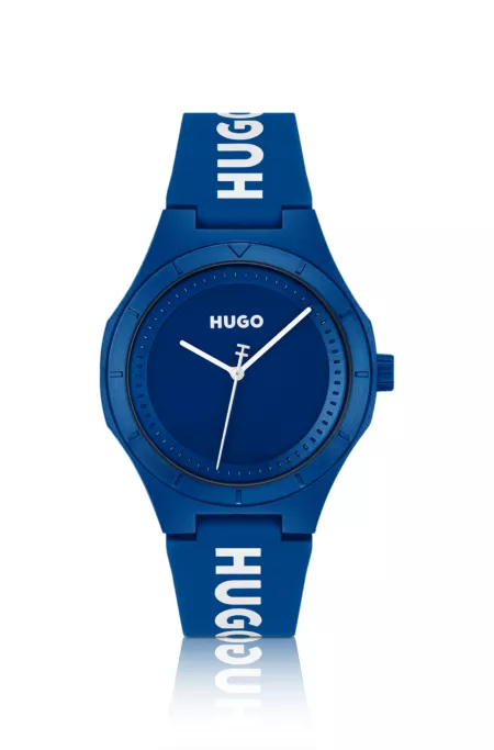 Blaue Uhr mit Logos auf dem Silikonarmband