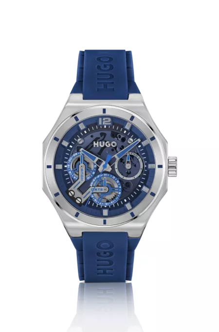 Uhr mit sichtbarem Uhrwerk und blauem Silikonarmband