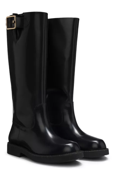 Complete cualquier look con el empeine de piel brillante y la suela ultraligera de estas botas altas BOSS Mujer. Monograma en todo dorado y adorno de hebilla.