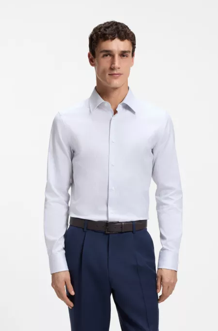 Una camisa business de corte recto BOSS Hombre. Elaborada en mezcla de algodón con un toque de elástico para facilitar el movimiento, esta camisa se ha sometido a un tratamiento de planchado fácil que simplifica su cuidado y refuerza la suavidad del tejido. La estructura de sarga y el ribete con logo incluido en el interior del cuello añaden elegancia a la prenda.