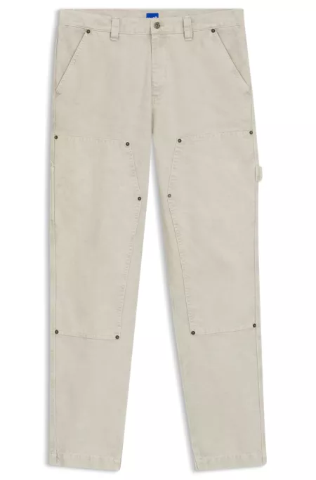 Estos pantalones HUGO Hombre en lona de algodón con lavado vintage tienen un estilo inspirado en la ropa de trabajo. Tapered fit. Confección con doble rodilla y ribetes con remaches.