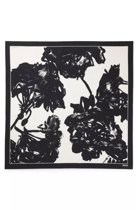 Un pañuelo BOSS Mujer de estilo elegante. Este accesorio de sarga de seda, hecho en Italia, está diseñado con un moderno estampado de motivos de la marca. Medidas: 90 x 90 cm.