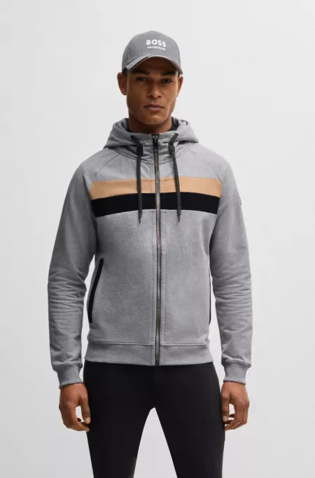 Esta sudadera BOSS Hombre regular fit con capucha y cremallera, elaborada en suave forro polar de algodón elástico italiano con interior cepillado, es una prenda cómoda para vestir a capas. Los ojales de silicona mantienen los cordones en su sitio mientras se monta. Rayas anchas en contraste de estilo deportivo.