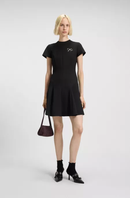 Vestido evasé con apliques de godet y broche de lazo