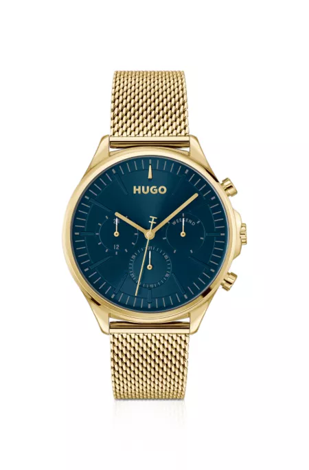 Dotée d’un cadran bleu à sous-cadrans et index Oversize, cette montre HUGO Homme séduit par son style épuré. Acier doré et bracelet moderne en maille milanaise.