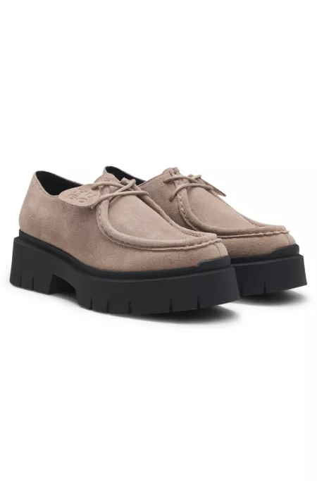 Ornées d’une étiquette logotée amovible, ces chaussures derby HUGO Femme apporteront une touche de dynamisme à toutes vos tenues. Tige en cuir suédé doux avec grosse semelle extérieure en gomme.