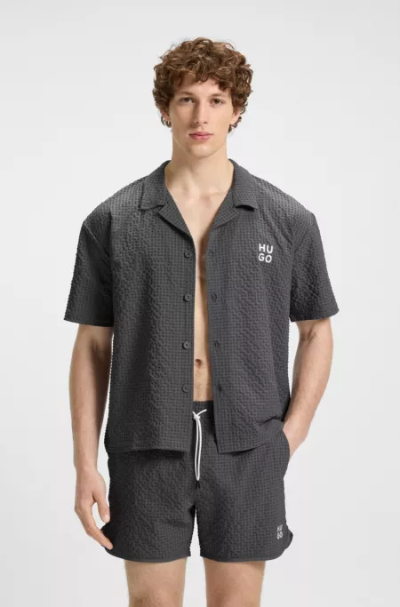 Cette chemise de plage HUGO Homme est confectionnée dans une matière gaufrée confortable et respirante. Coupe décontractée confortable. Logo revisité contrastant brodé.