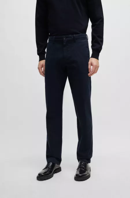 Un chino polyvalent BOSS affichant une coupe droite classique. Cette pièce Regular Rise est confectionnée en gabardine de coton stretch à la finition brossée douce.