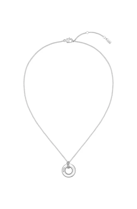 Un collier féminin BOSS Jewelry, confectionné en acier inoxydable et pourvu d’un anneau à strass ainsi que d’un maillon à logo gravé. Longueur : 46 cm avec extension de 5 cm