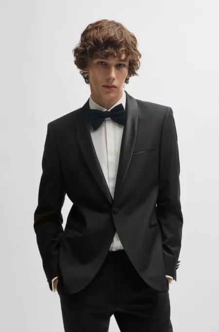 Une veste de smoking Extra Slim HUGO Homme avec finitions en satin ton sur ton. Cette pièce élégante est confectionnée en stretch mélangé pour plus de confort.