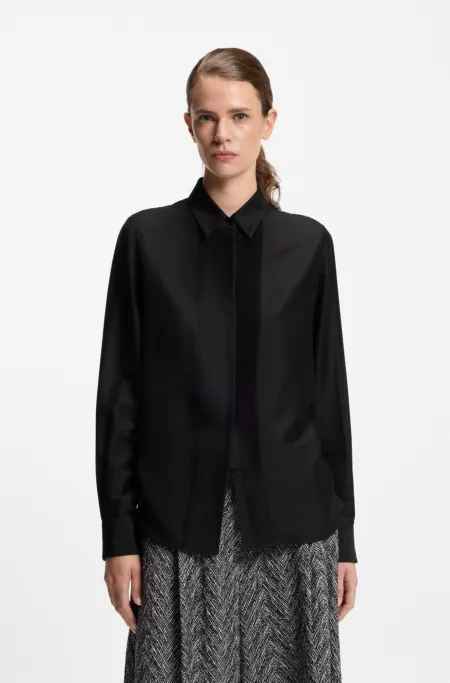 Que ce soit avec un jean ou un tailleur, ce chemisier coupe standard BOSS Femme apportera une touche d’élégance naturelle d’inspiration smoking à toutes vos tenues. Tissu semi transparent à teneur en soie et laine.