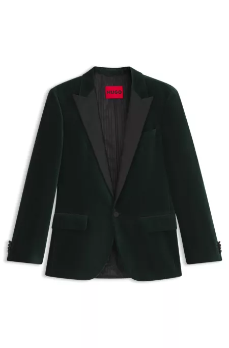 Que vous l’associez à un jean ou un pantalon ajusté, cette veste de smoking HUGO Homme est la pièce de soirée idéale. Velours de coton doux avec finitions en satin. Coupe ajustée.
