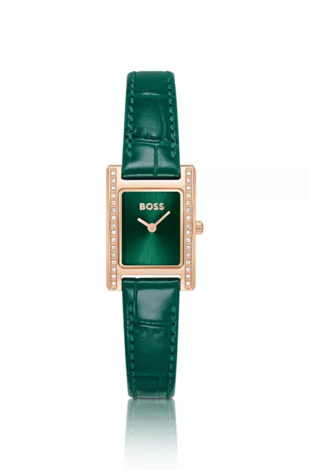 Montre avec cadran vert à strass et bracelet en cuir vert