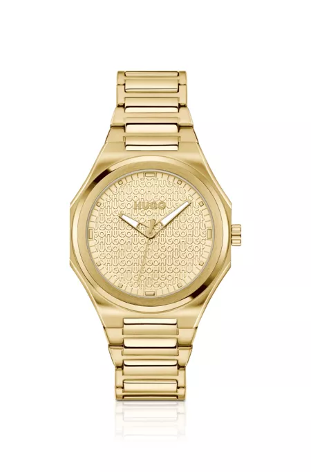 Dotée d’un cadran soleillé brossé orné de logos en relief, cette montre HUGO Femme séduit par son style inventif. Acier doré et bracelet à maillons intégré.