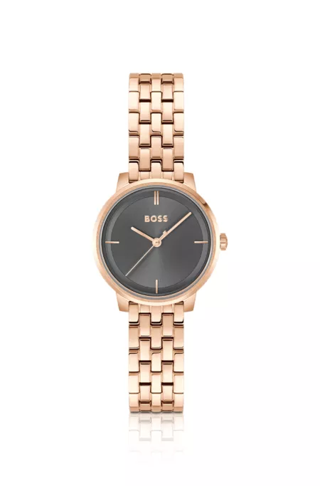 Associant une couleur or incarnat et un cadran gris raffiné, cette montre BOSS Femme séduit par sa forme ronde élégante. Index appliqués minimalistes. Bracelet à cinq maillons.