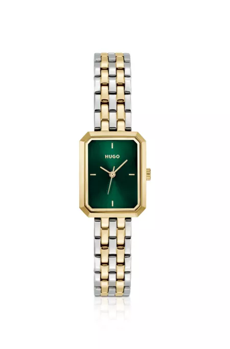 Dotée d’un cadran vert brossé à index appliqués simples, cette montre HUGO Femme mise sur une sophistication moderne. Boîtier rectangulaire. Bracelet à maillons aux finitions argentées et dorées.