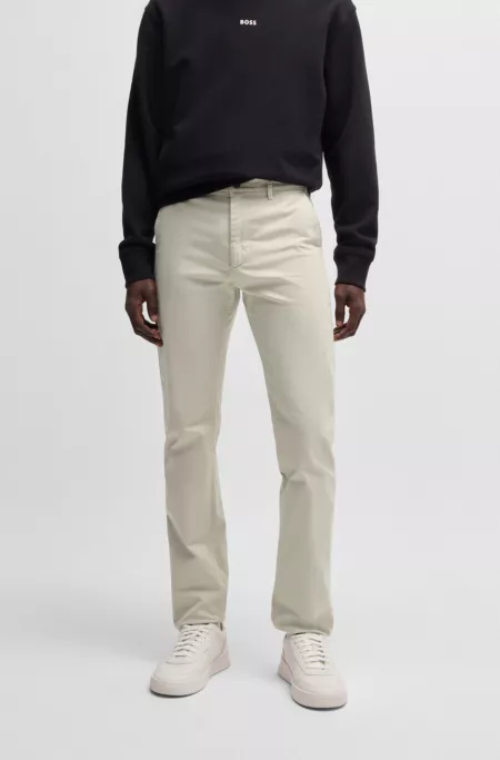 Chino BOSS Homme en satin de coton surteint et stretch confortable, à la coupe fuselée modernisée. Taille régulière. Détail logo au dos.
