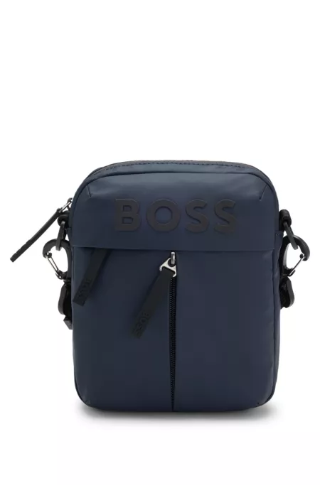 A reporter bag by BOSS, crafted in synthetic coated fabric with a detachable shoulder strap and signature trims including a large logo. Synthetic coated fabric, sometimes referred to as faux leather, is a fabric designed to resemble real leather, and/or display a matte, glossy, smooth, or textured, coated appearance. Measurements: 16 x 20. 5 x 4. 5cm