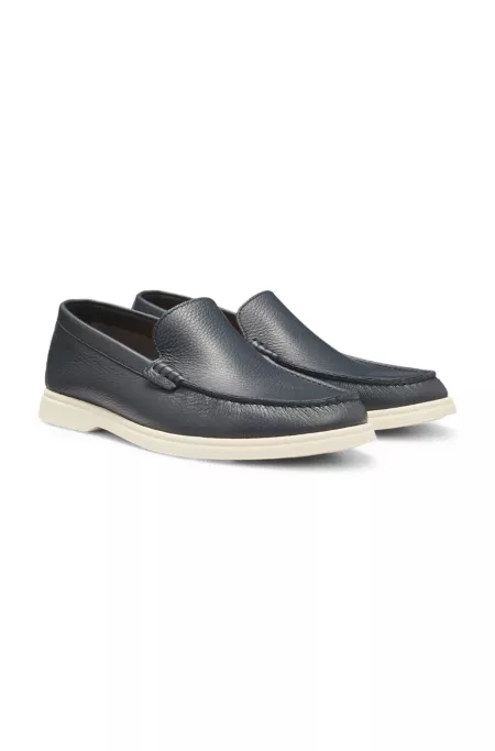 Slip-on moccasins by BOSS Menswear. Crafted in Europe from tumbled leather, this pair has a durable outsole and subtle logo accent.