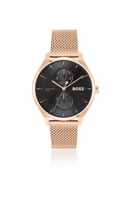 Black-dial watch with carnation-gold-tone mesh bracelet