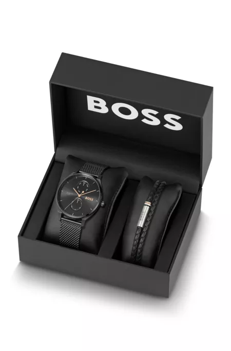 Tyler Mesh-bracelet watch and braided leather cuff gift set