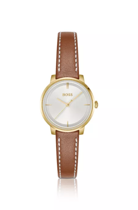 Complete everyday looks with the sleek, round case of this minimalist BOSS Womenswear watch. Yellow-gold effect. Brushed silver-white dial. Slimline leather strap.