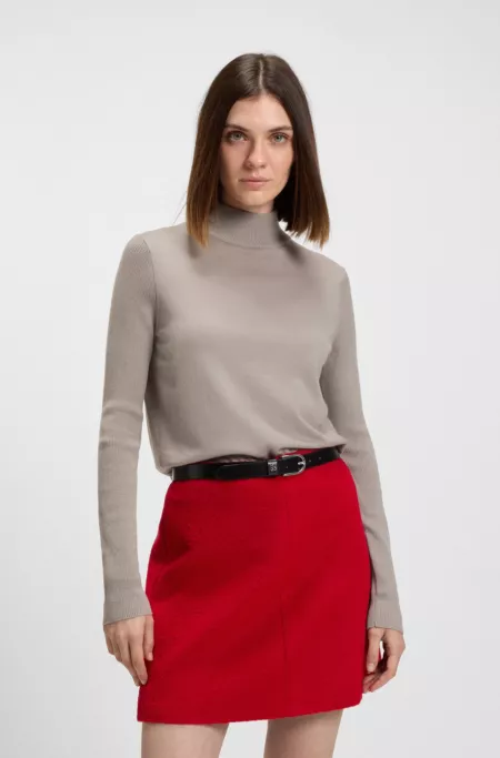 With a straight fit in extra fine merino wool, this mock neck HUGO Womenswear sweater is ideal for winter layering. Embroidered stacked logo.