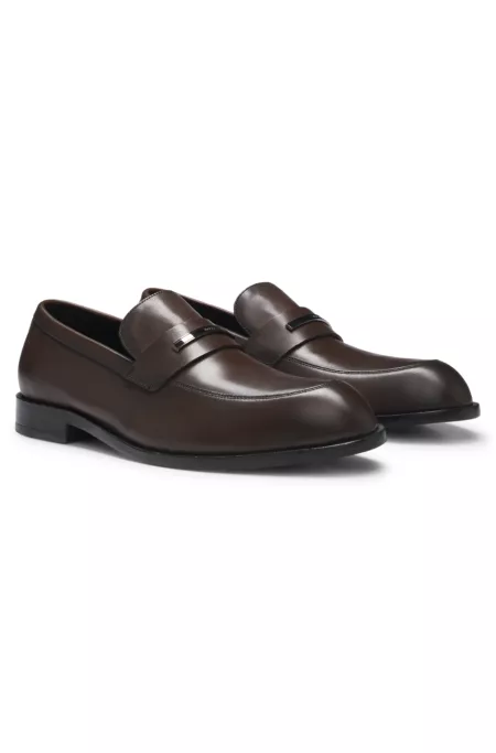 Shaped in smooth leather, these BOSS Menswear loafers add distinctive style to any look. Metal logo trim at the vamp. The leather used to make this product has been sourced from certified tanneries.