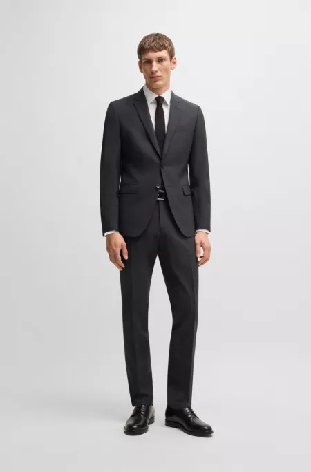 Give your working week a refined update with this BOSS Menswear suit. Crafted in virgin wool blended with stretch for comfort and crease resistance, this two-piece ensemble is tailored to an easy regular fit. The solid weave makes formal styling simple.