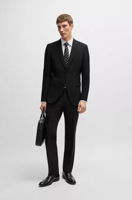 This BOSS Menswear suit jacket brings timeless elegance, with its serge weave in virgin wool and constructed shoulders. Slim fit with natural stretch for ease.