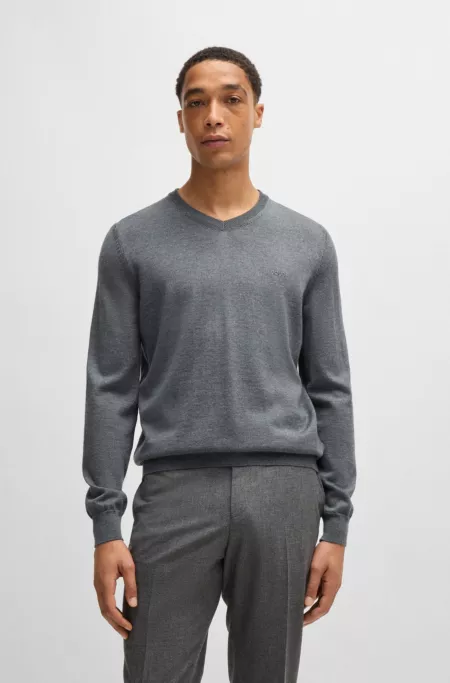 V-neck sweater in virgin wool with embroidered logo