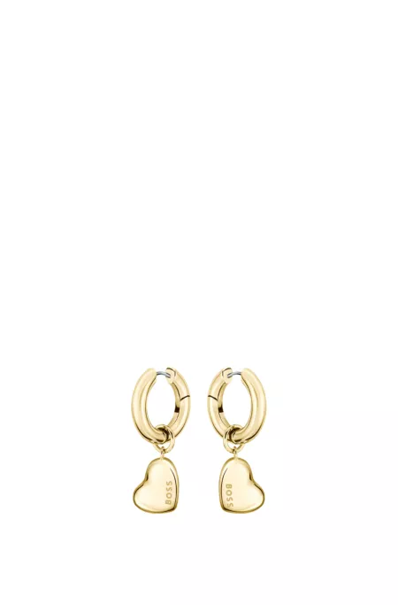 Hoop length: 2cm. Charm length: 1. 5cm These earrings by BOSS Jewelry exude effortless chic with elegantly curved heart charms suspended from huggie hoops. Polished gold tone steel. Subtle branding. Hinge closure.