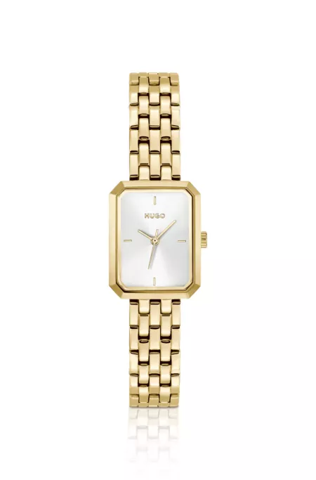 Rectangular gold-tone watch with white dial