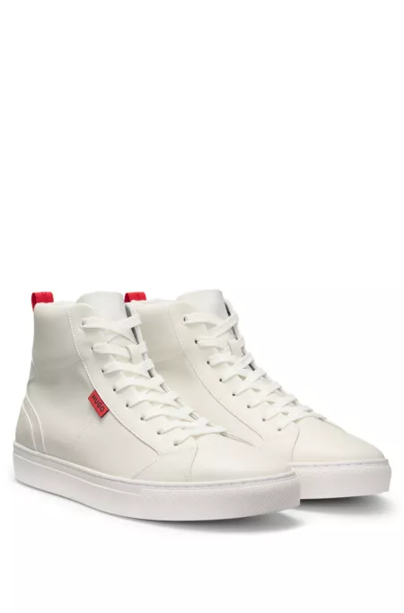 With comfortable cushioning at the collar, these HUGO Menswear high-top trainers are a solid casual choice. Crafted in synthetic coated fabric. Synthetic coated fabric, sometimes referred to as faux leather, is a fabric designed to resemble real leather, and/or display a matte, glossy, smooth, or textured, coated appearance.