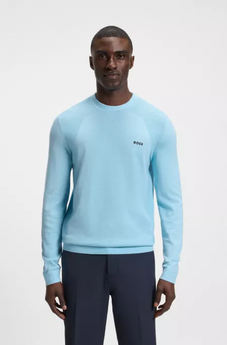 With structured body mapping and contrast branding, this regular fit BOSS Menswear sweater is a modern layer for your casual collection. Thermo regulating cotton blend.