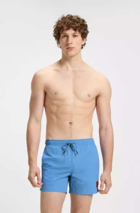 Update your summer collection with the modern logo trim of these HUGO Menswear swim shorts. Cut in naturally quick drying fabric. This product contains at least 80% better raw materials. This product is partially made with recycled cotton.