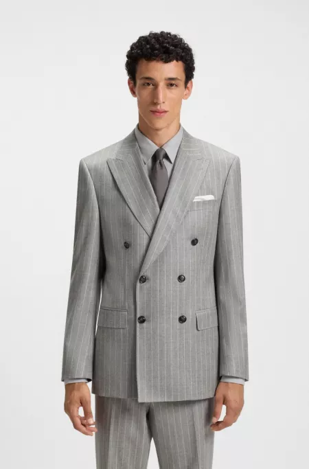 Cut in virgin wool with natural stretch, this double breasted BOSS Menswear suit jacket is a strong choice for formal moments. Classic vertical stripe.