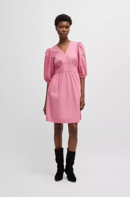V-neck dress in cotton poplin with ruched waist