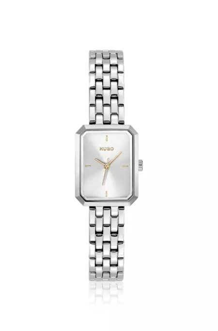 Rectangular stainless-steel watch with silver-white dial