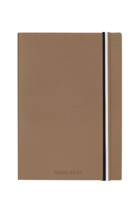 Camel faux-leather A5 notebook with signature-stripe strap