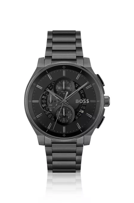 Black-plated chronograph watch with transparent dial