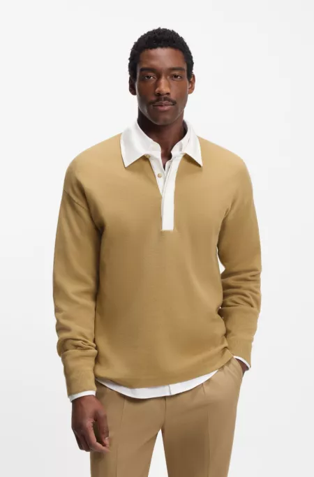 Blending cotton and virgin wool, this BOSS Menswear sweater makes a modern statement with its rugby style contrast collar and placket. Easy relaxed fit.