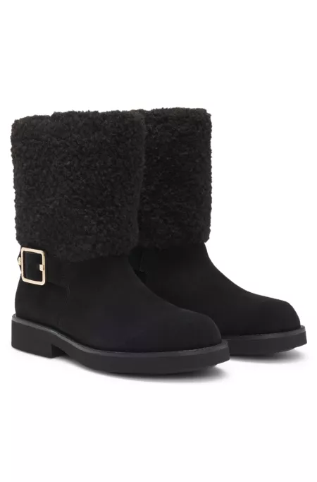 Combining a fluffy collar with rich suede, these cozy BOSS Womenswear boots update a biker classic. Buckle detail with monogram trim. Lightweight outsole. Warm insole.
