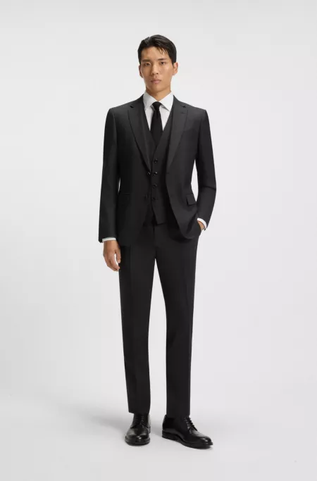 Expertly crafted with constructed shoulders and AMF stitching details, this three-piece BOSS Menswear suit is a sophisticated option for work and special occasions. Woven in breathable wool, plus added stretch for ultimate comfort. A refined micro pattern gives it extra character. Clean, streamlined silhouette.