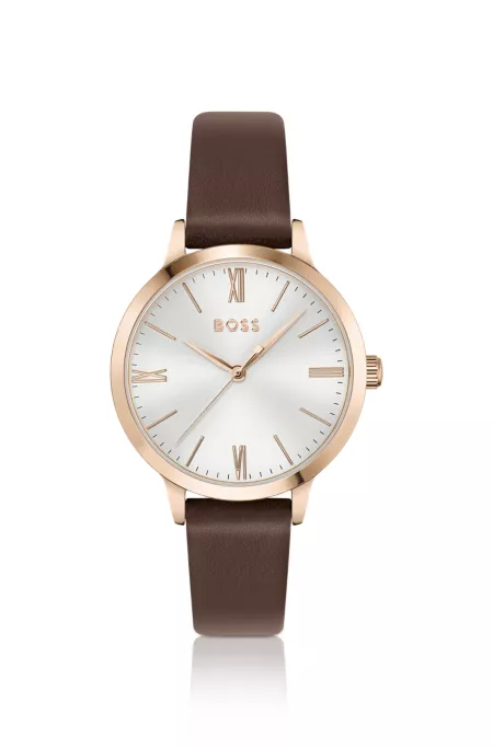 An elegant watch by BOSS with a classic silver-white dial and Roman numerals. This understated accessory secures with a brown leather strap.