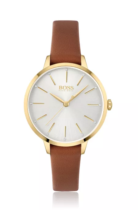 A feminine watch with a three-hand movement by BOSS. Fastening with a brown leather strap and branded buckle, this watch is set with a silver-white dial featuring crystal accents and stick indexes. The cleanly styled case and lugs are crafted in cool steel with a yellow-gold effect for understated elegance.